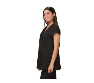 Gilet nero da donna, è realizzata in tessuto 100% poliestere, il tessuto non necessita della stiratura e asciuga anche facilmente. Il gilet presenta 5 bottoni sul davanti dello stesso colore del gilet, due finti taschini sul davanti e riprese sul seno. Ideale giacca da lavoro per hostess, cameriere e coloro che lavorano nelle reception.