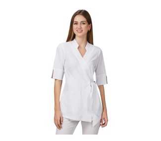 Blusa Cruzada realizzata con il tessuto pregiato Plana, il quale garantisce una vestibilità perfetta su qualsiasi fisicità e resistenza all'usura quotidiana oltre che freschezza durante l'utilizzo. Il modello dalla linea elegante presenta la manica 3/4 e lo scollo a V, il fiocco in vita invece fa sì che il capo venga regolato in base alle proprie esigenze estetiche. Ideale nel settore bellezza...