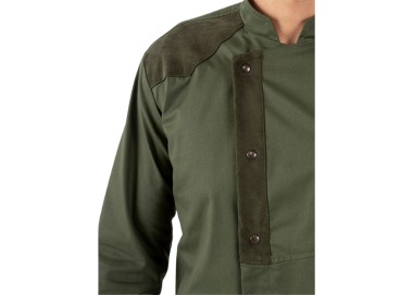 Inserti traspiranti nel giromanica; taschino portapenne su manica sinistra, polsini richiudibili con bottoni a pressione; carré, il taschino e l’abbottonatura anteriori sono arricchiti da inserti in tessuto bengalina smerigliato, tono su tono. Carré posteriore, tagli e cuciture sagomati e due spacchetti Vestibilità slim.