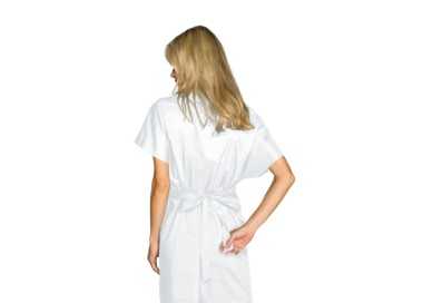 Si presenta con la manica corta, allacciatura posteriore e due pratiche tasche anteriori e scollo a V.