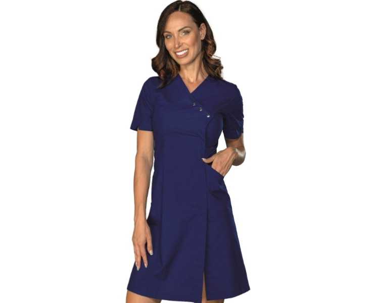 Il camice presenta la manica corta e abbottonatura sul petto mediante tre bottoni automatici in metallo a vista, scollatura leggermente a V e pratica tasca presente sui due lati.