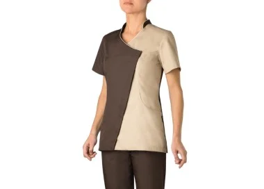 La casacca è a mezza manica e presenta una chiusura curva, tramite bottoni a clip, collo alla coreana e profilo di colore beige. In basso sono presenti due tasche capienti.