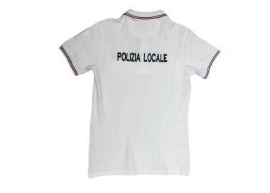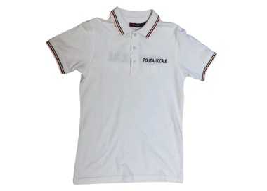 Polo mezza manica 100% cotone colore bianco con tricolore sul colletto e su fondo manica, scritta ricamata ante-retro "Polizia Locale" e completa di base velcro sia sul petto per eventuale applicazione grado e base velcro sul braccio per eventuale applicazione scudetto Regionale.